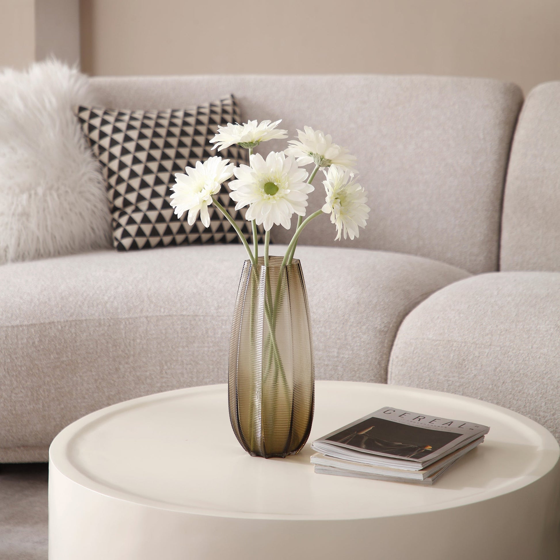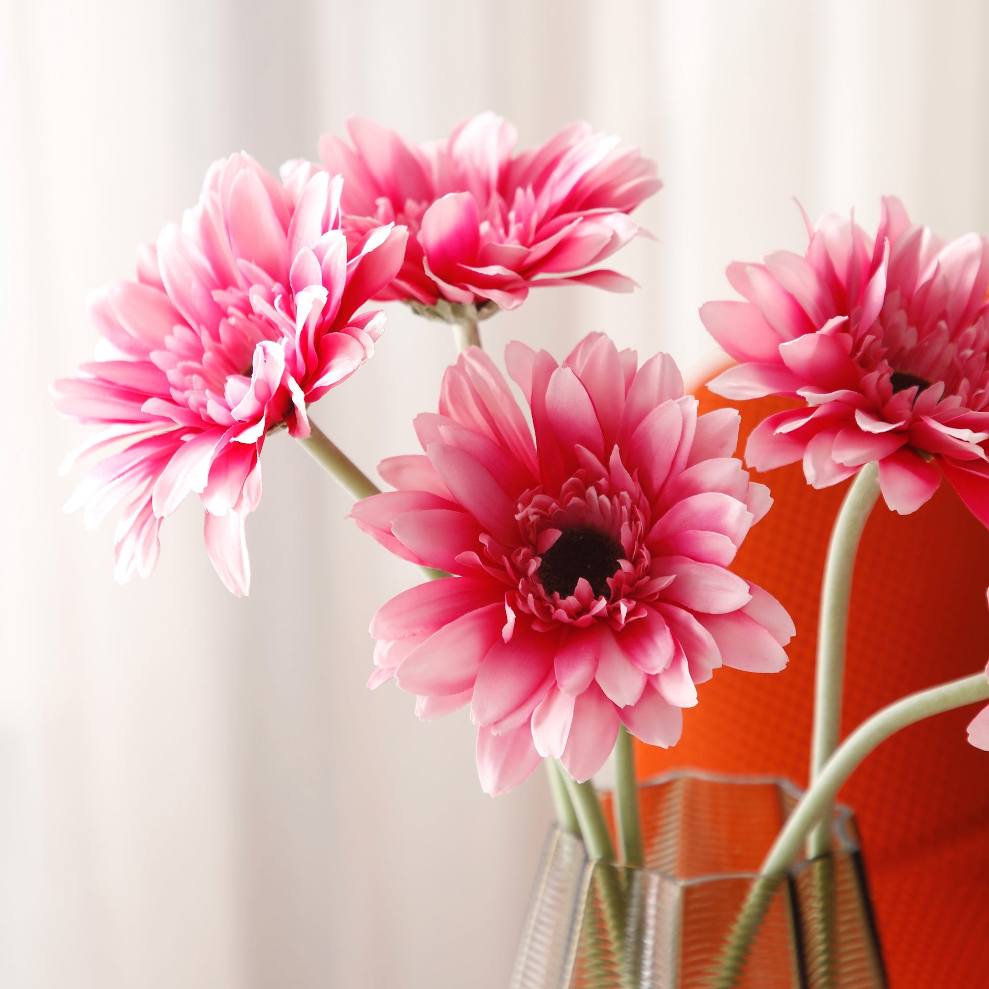Très grande tige artificiale di gerbera ideale in un lungo vaso in alto. Son nom commun est d'ailleurs la marguerite du Transvaal, du nom d'une région de l'Afrique du Sud. Nel linguaggio dei fiori, il significato della gerbera è l'amore profondo, i tendres pensées. Associa almeno 5 tiges per comporre un bouquet.